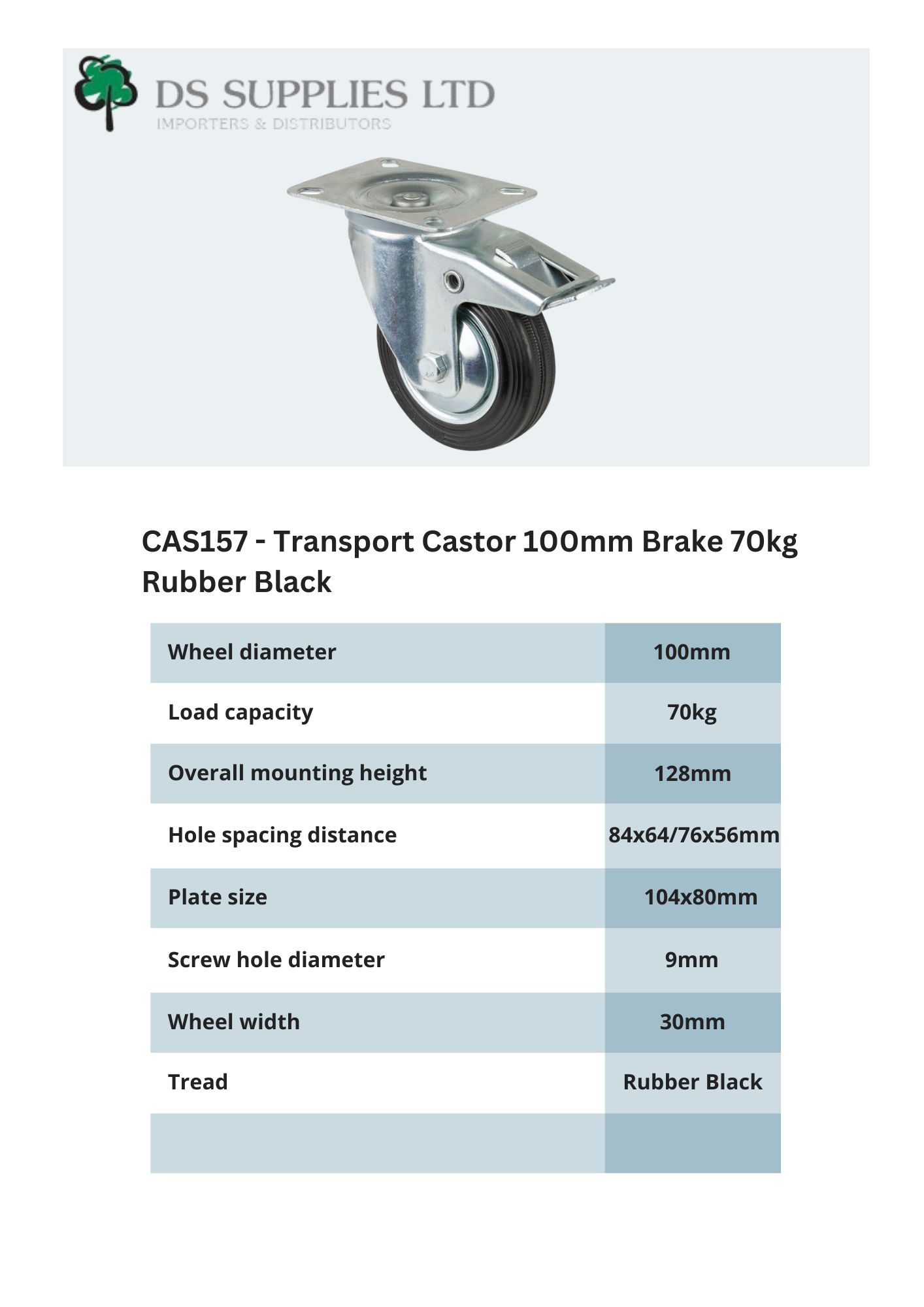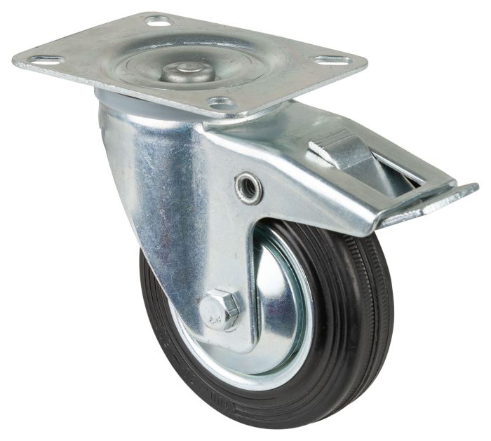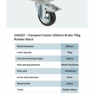 Transport Castor 100mm Brake 70kg Rubber Black