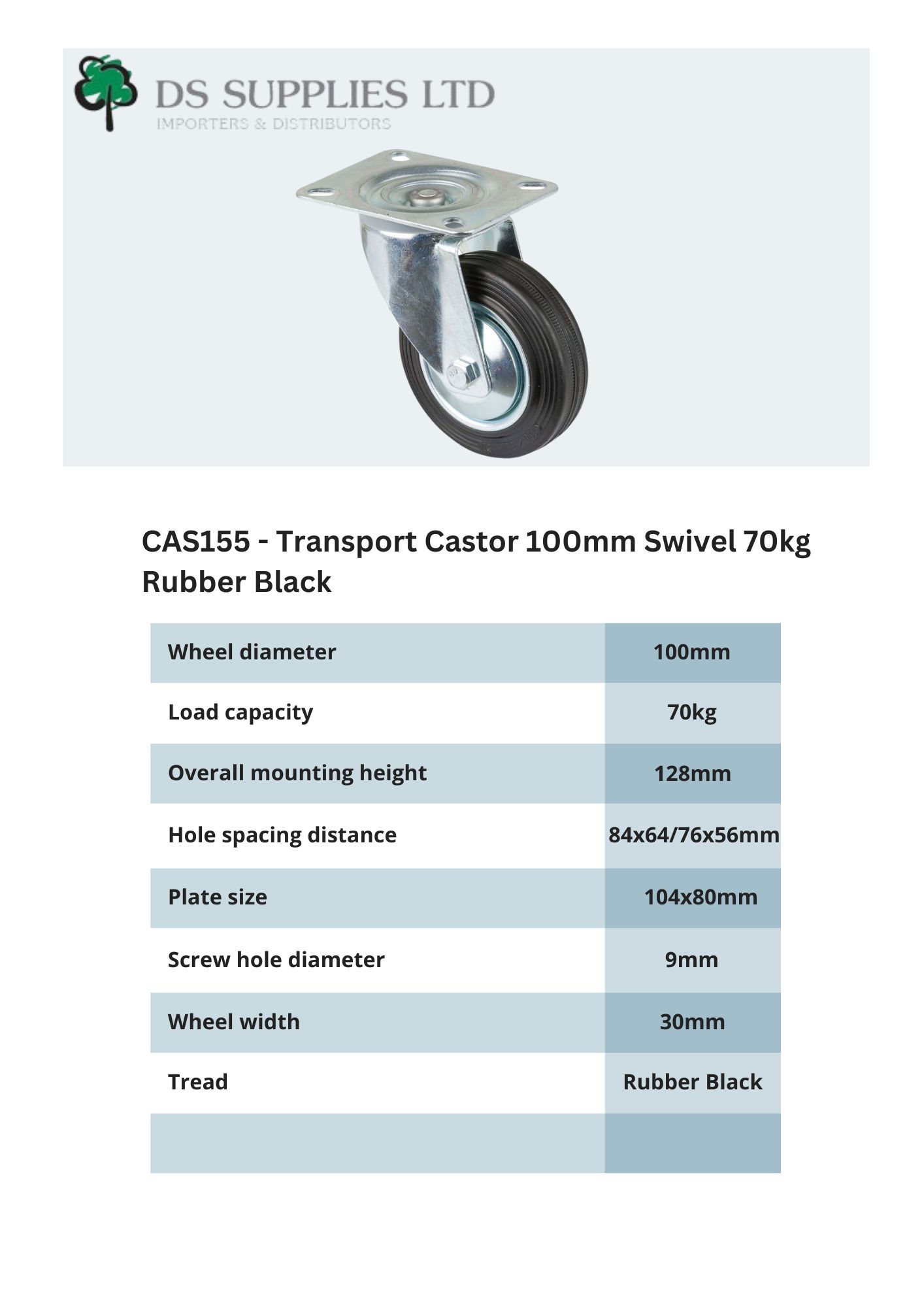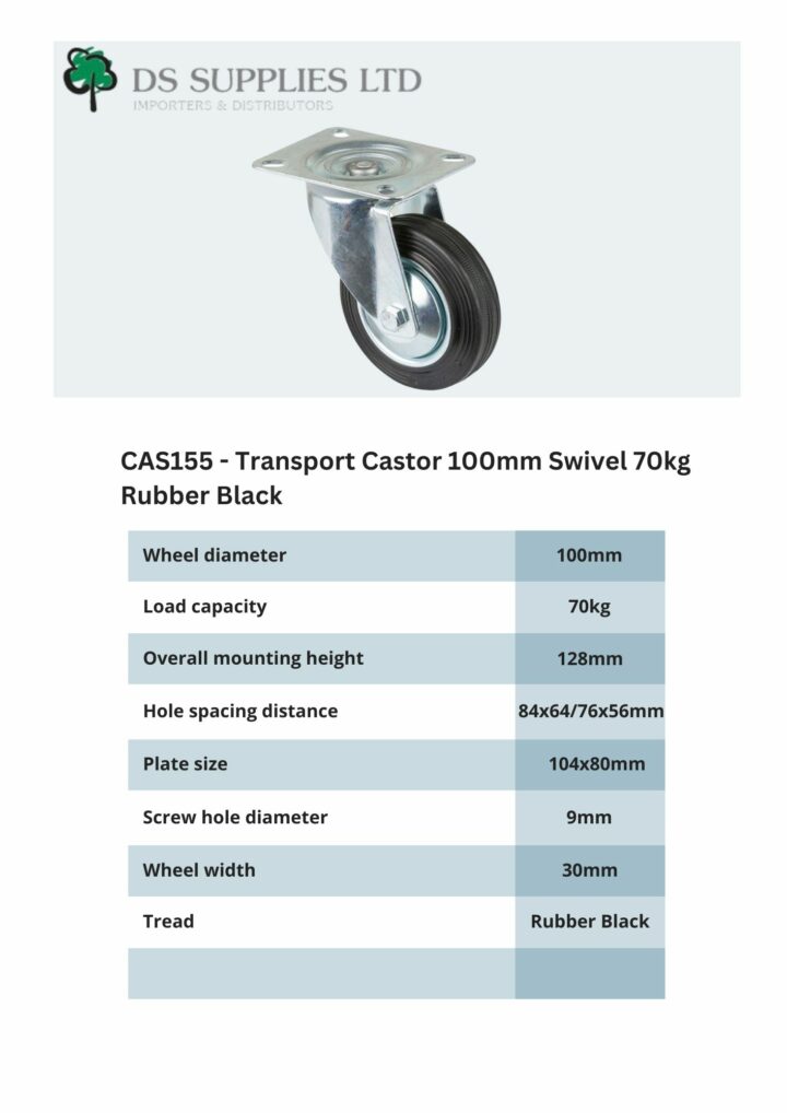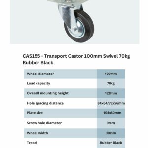 Transport Castor 100mm Swivel 70kg Rubber Black