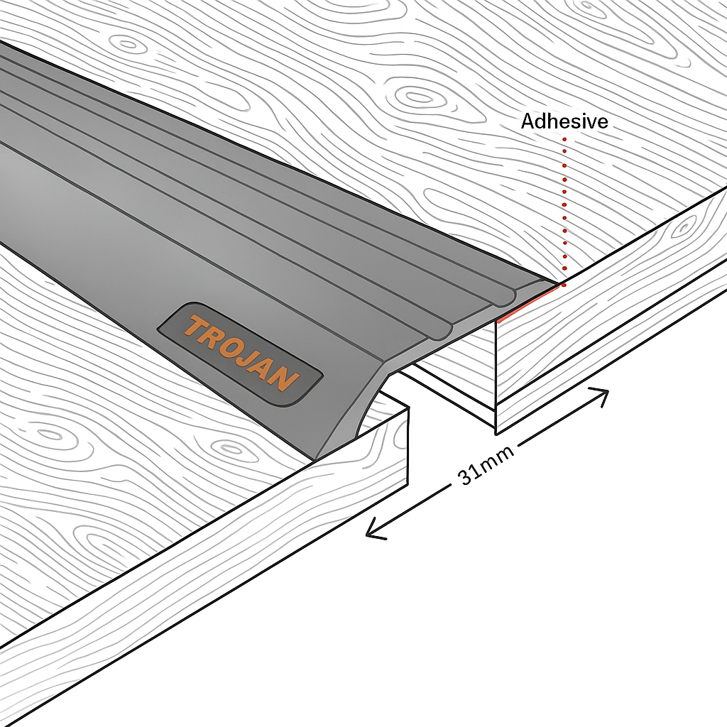 The Trojan A45 reducer creates a smooth transition between two floor types of different heights. It can be used between wood floors and carpet or vinyl.